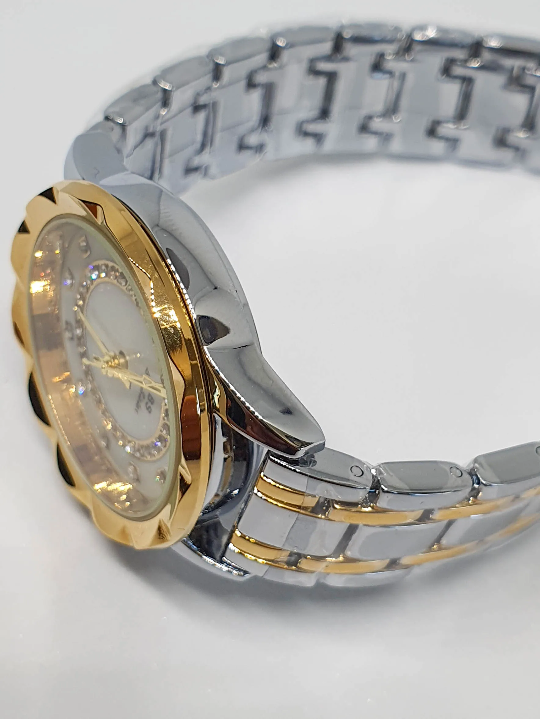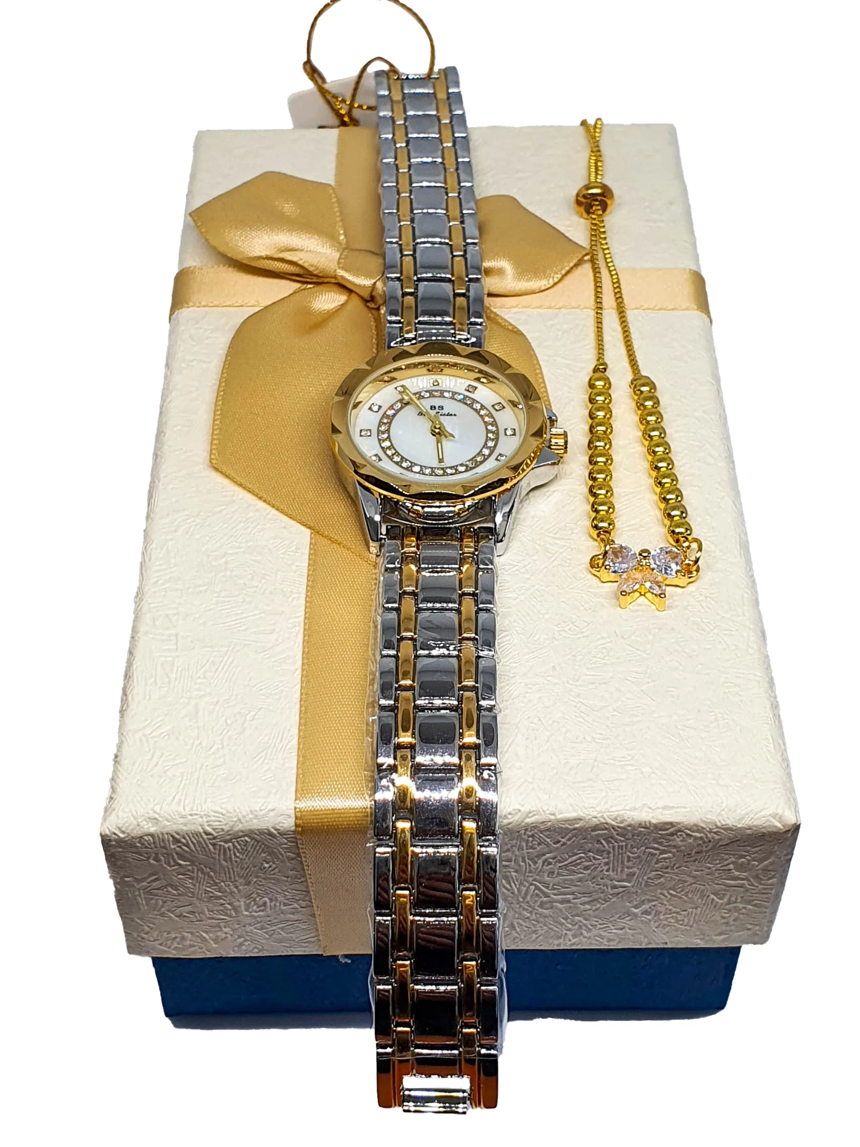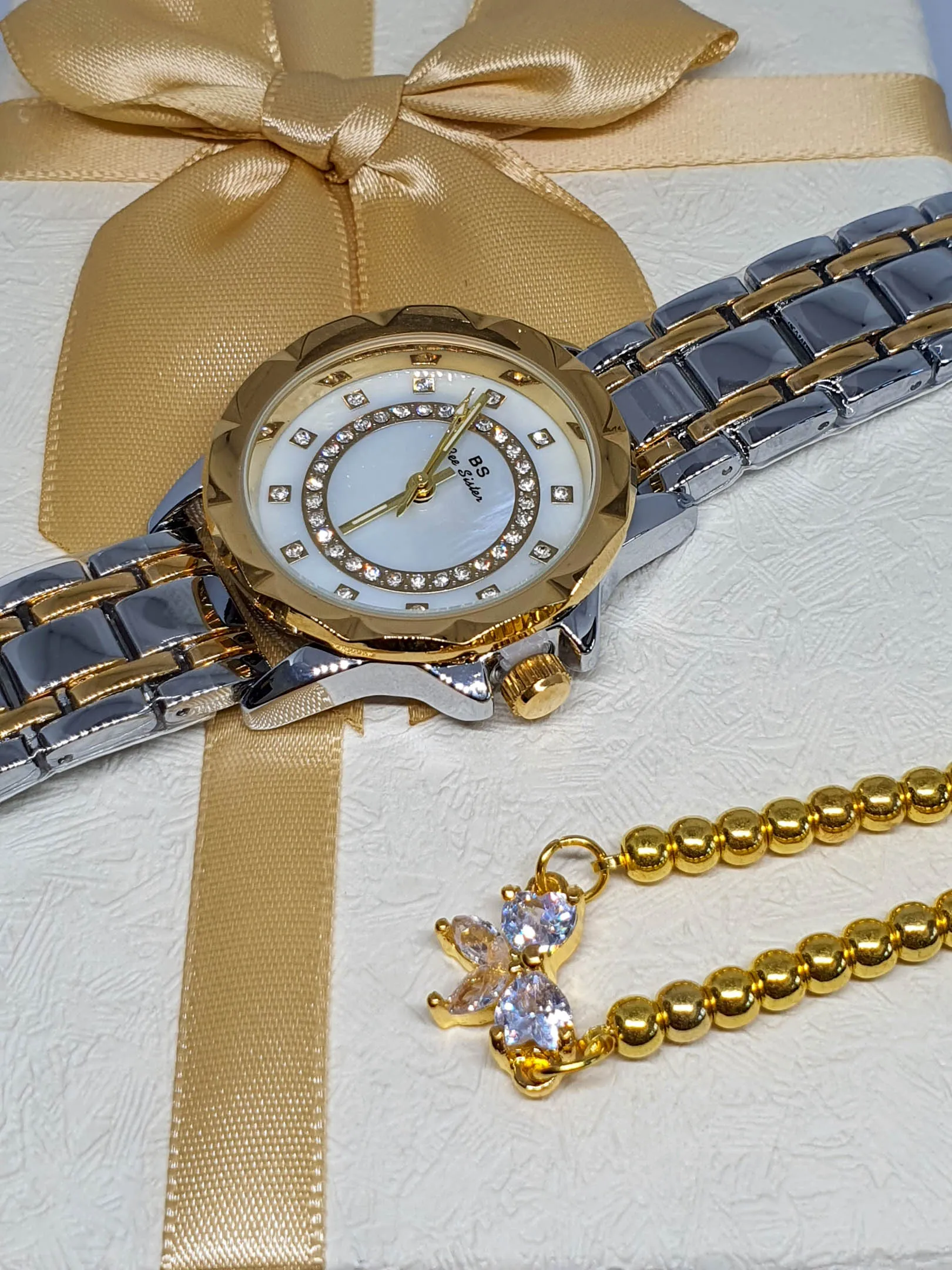 O Conjunto Bee Sister 1506 é a expressão perfeita de requinte e atenção ao detalhe. O relógio analógico destaca-se pelo seu design luxuoso em tons dourados e inox, combinando um mostrador refinado com acabamento polido e bracelete metálica de textura elegante.