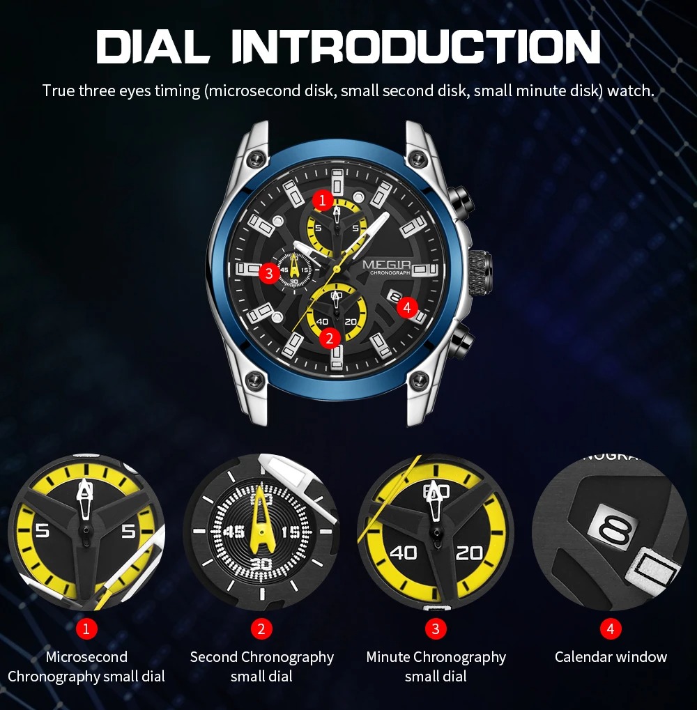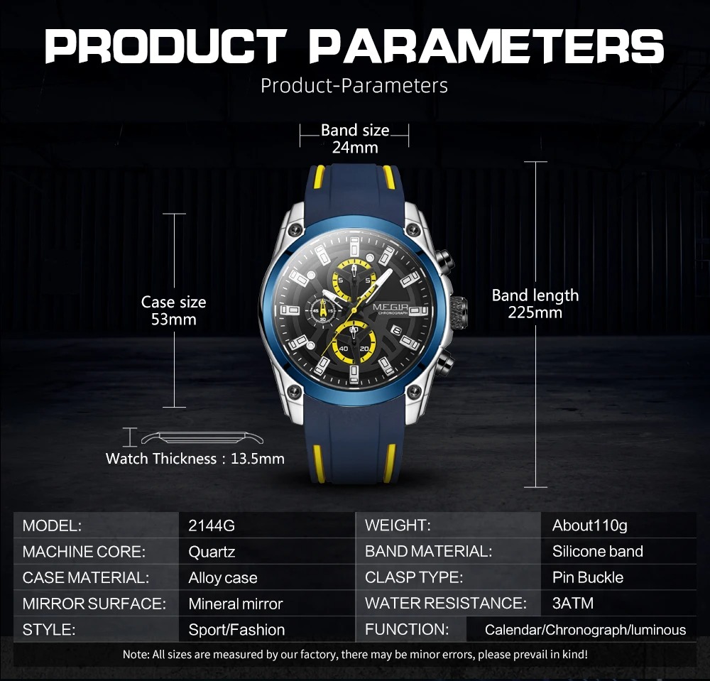 Relógio analógico MEGIR 2144. Movimento quartzo com mostrador redondo e bracelete em silicone.