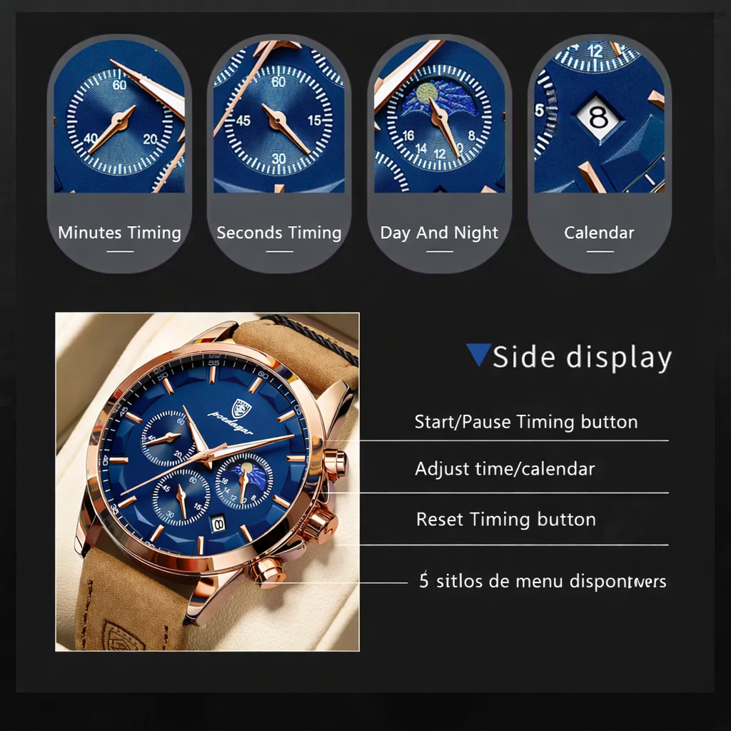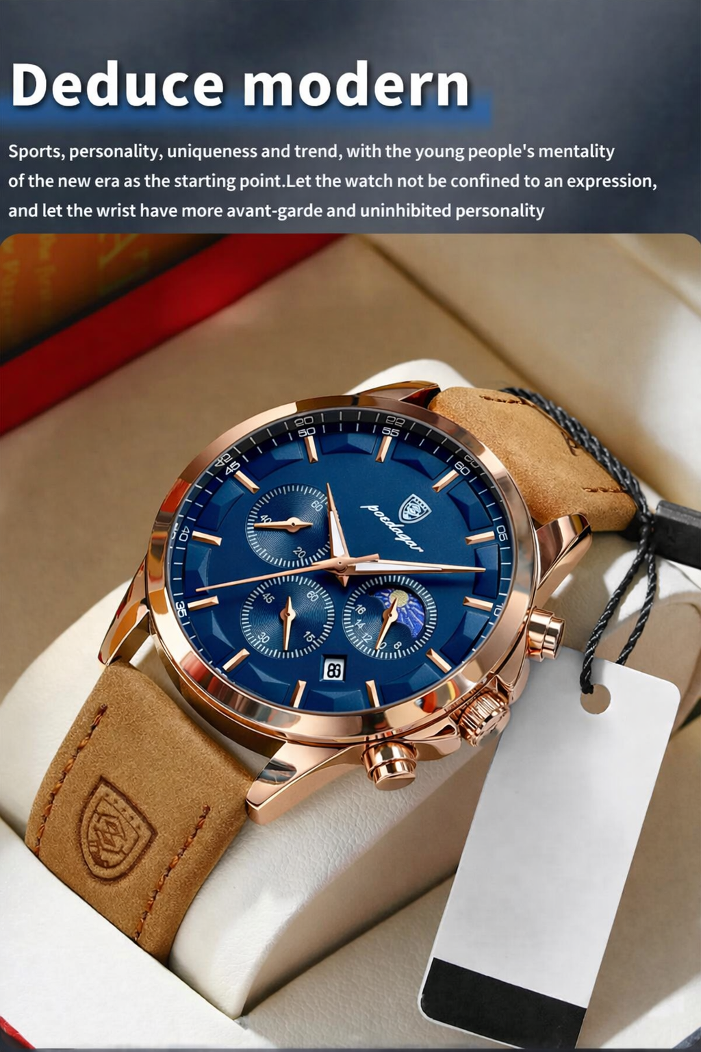 O Poedagar 928 é um relógio analógico que combina sofisticação e robustez num design intemporal. Com mostrador detalhado, acabamento elegante e bracelete em couro, é a escolha ideal para quem valoriza estilo, presença e qualidade no dia a dia ou em ocasiões especiais.