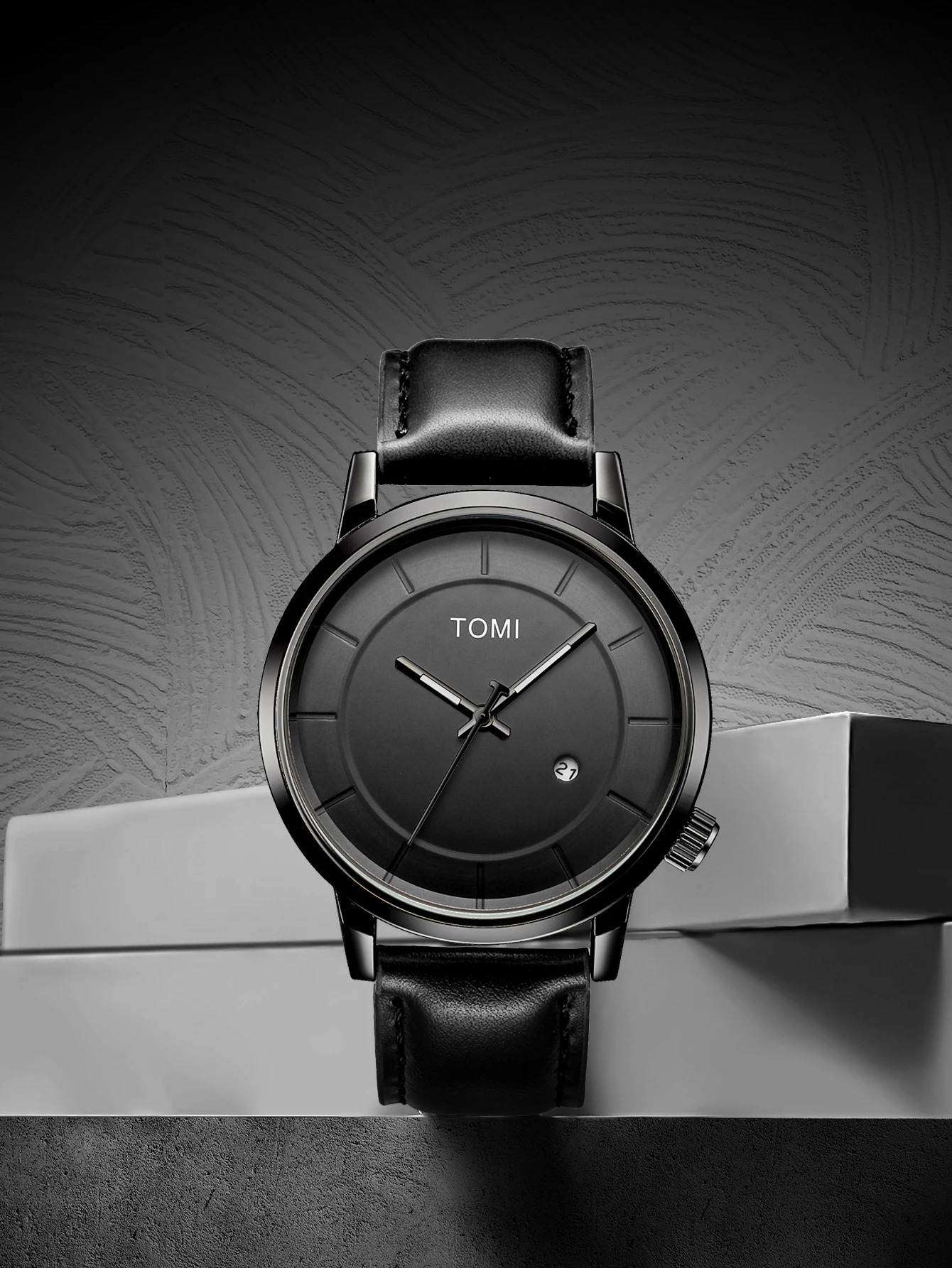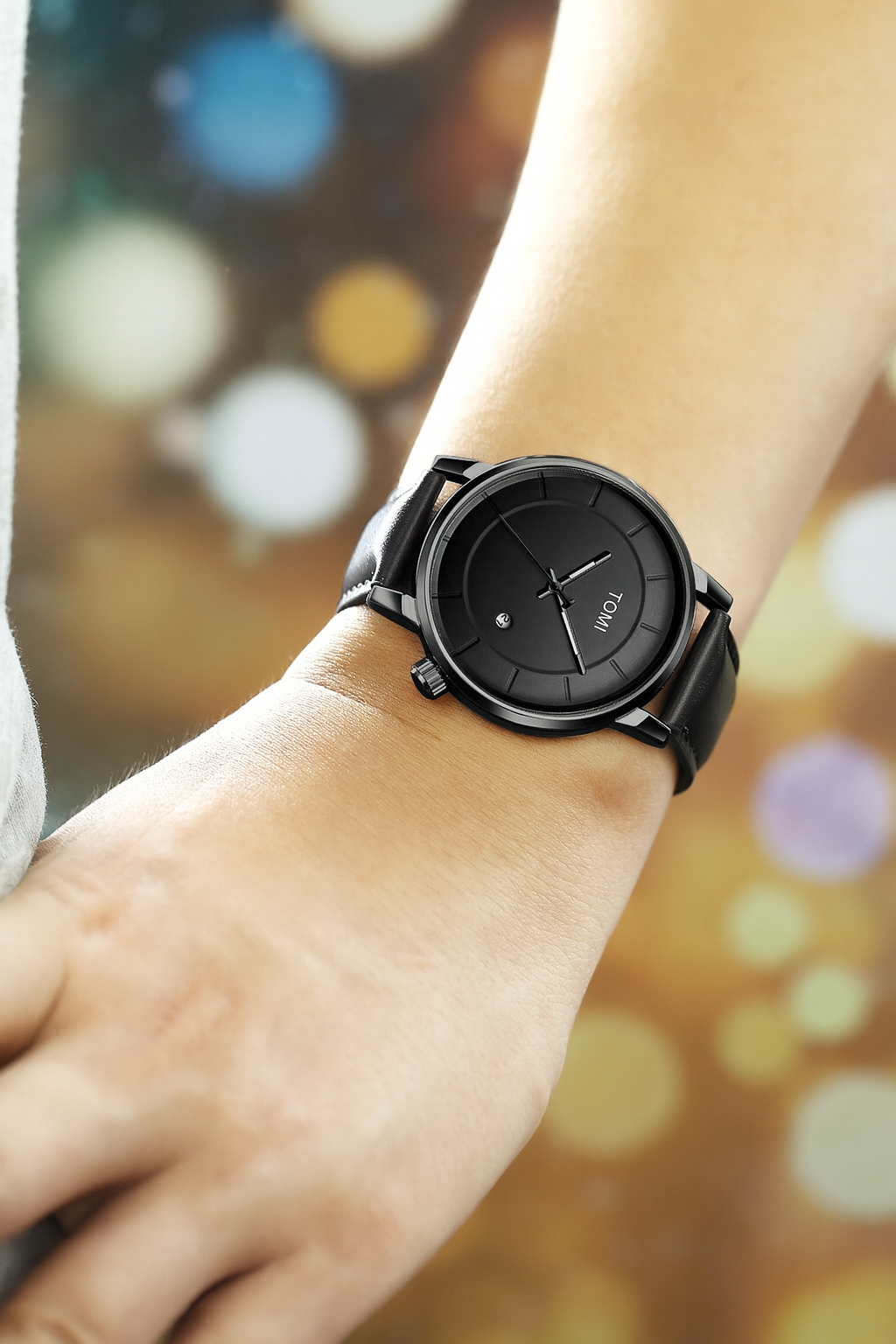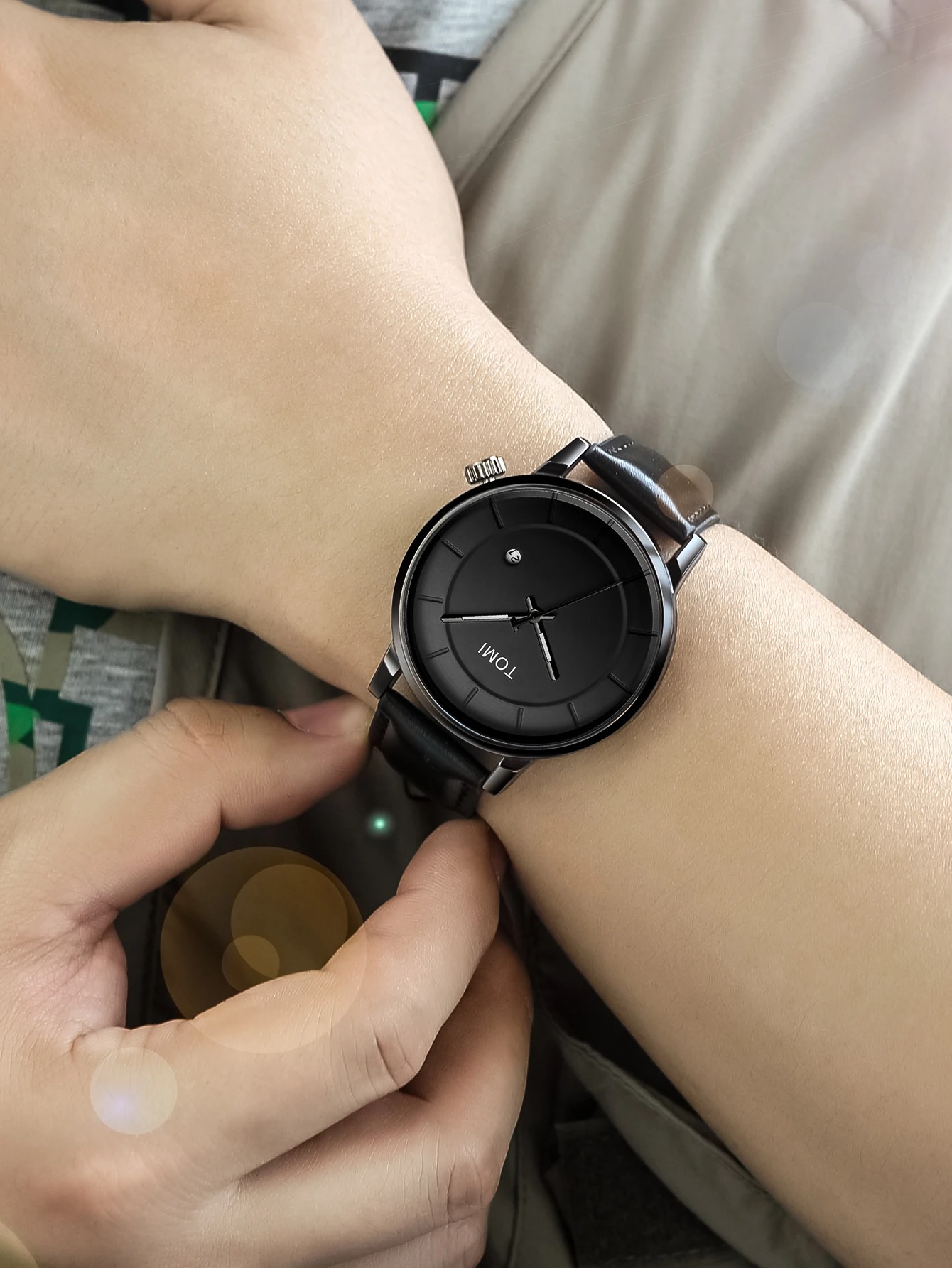 Relógio analógico minimalista T101, movimento quartzo com mostrador redondo e bracelete em couro sintético.